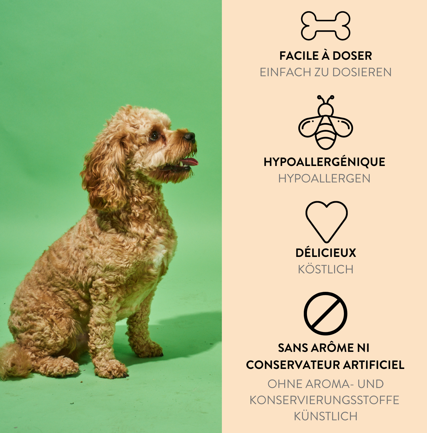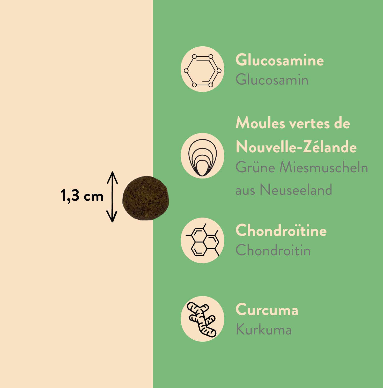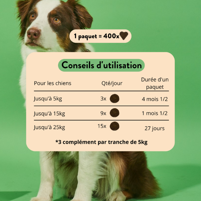Mes chiens l’adorent ! Tout les matins je leur donne leur complément et ils les mange volontiers ! Plus de raideur plus de douleur leur articulations fonctionnent à merveille !