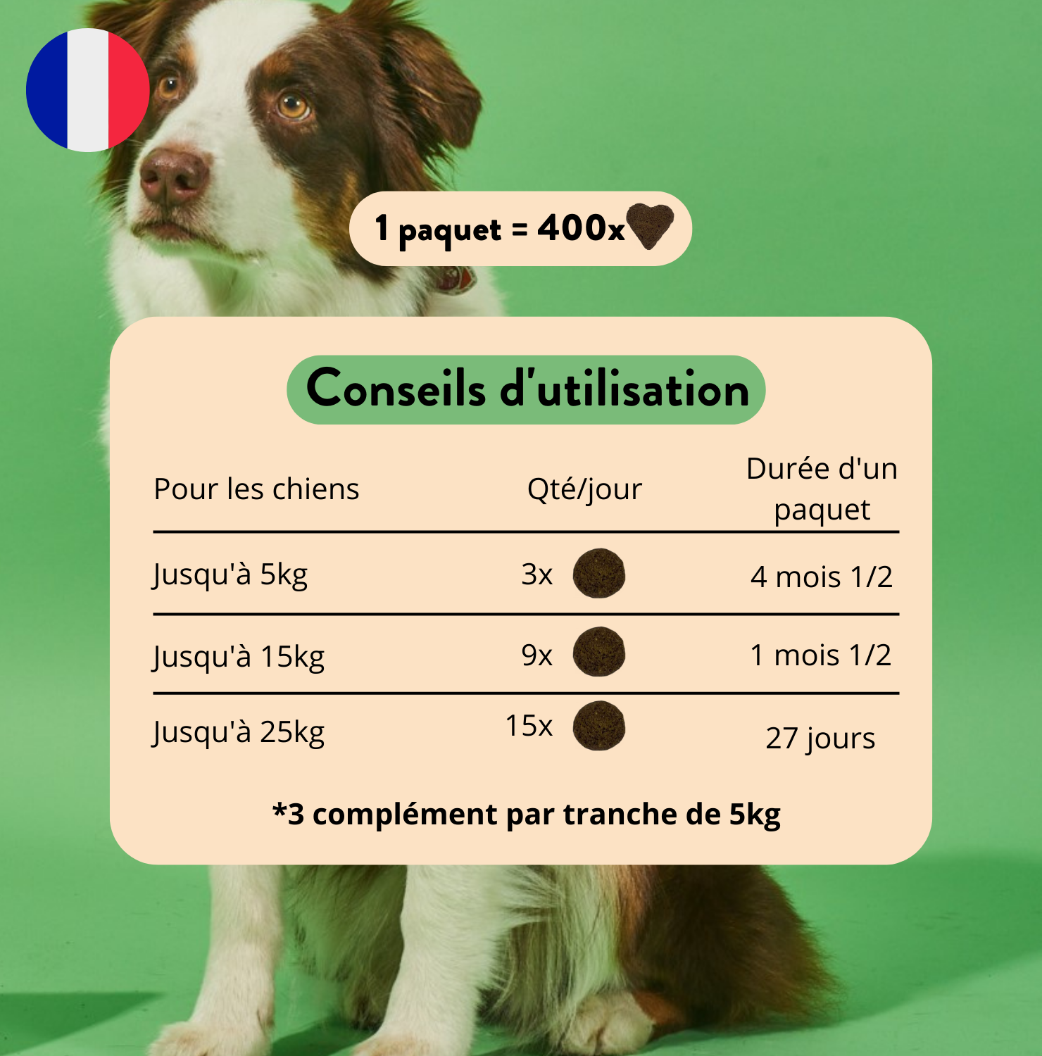 Notre petite Shitzu de bientôt 17 ans vous dit un très grand merci. Depuis la prise de votre complément alimentaire, elle a retrouvé sa mobilité de jeunesse. Elle monte à nouveau les escaliers comme une jeunette ! (Constatation que j avais pu faire déjà sur un Bearded de 10 ans et qui m a incité à découvrir Hello Jack ! En plus notre chienne adore ces compléments qu elle attend comme des friandises. ( nous avons à présent plus de 5 semaines de recul ) Nous ne pouvons que recommander ces compléments !